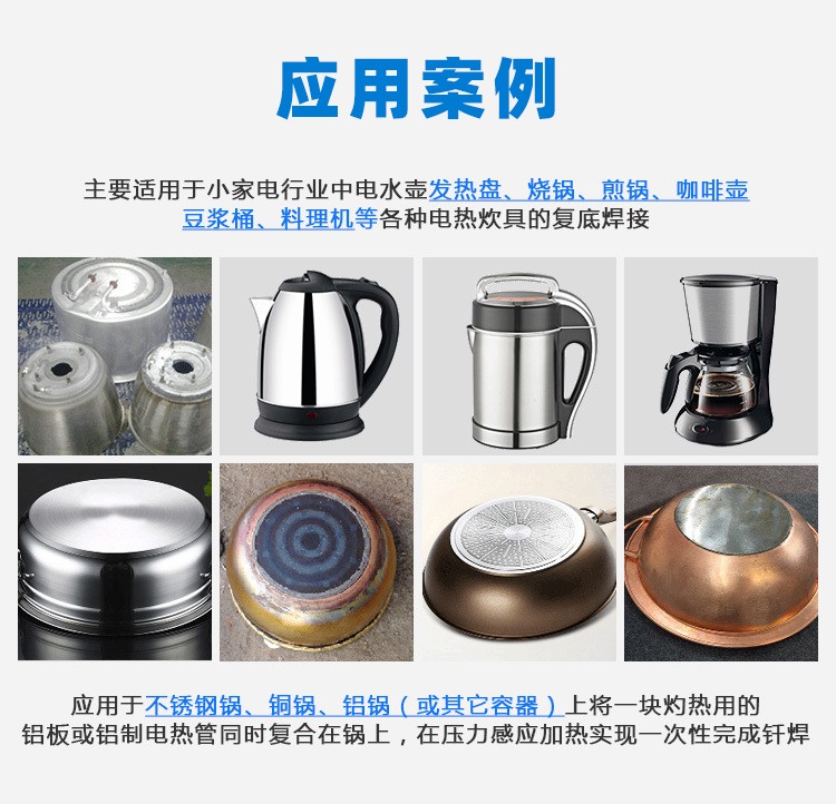 别名Q高频焊接机 型号QHT-QHJ ?sh)压Q?80V 功率Q?5-250kw 用途:应用于不锈钢锅、铜锅、铝?(或其它容?上将一块灼热用的铝板或铝制늃同时复合在锅上Q在压力感应加热实现一ơ性完成钎?/br>