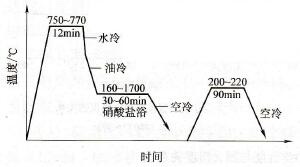 三、優(yōu)化淬火溫度提高工模具壽命 淬火溫度是鋼件淬火過(guò)程的重要工藝參數(shù),常用鋼的淬火溫度在熱處理手冊(cè)和有關(guān)技術(shù)書(shū)中都有數(shù)據(jù)可查,在生產(chǎn)中一般皆以此為選擇淬火溫度的依據(jù),這是無(wú)可非議的。但是,隨著近兒年來(lái)對(duì)馬氏體形貌和強(qiáng)韌化原理的深人研究,以及大量的工藝試驗(yàn)和實(shí)踐,為我們?nèi)绾胃侠淼剡x擇淬火溫度,提供了新的依據(jù)和經(jīng)驗(yàn)。由于在制定工藝或?qū)嶋H操作中,能正確選振和嚴(yán)格控制淬火溫度,往往可以使多種工模具的使用壽命顯著提高,取得明顯的經(jīng)濟(jì)效益。
