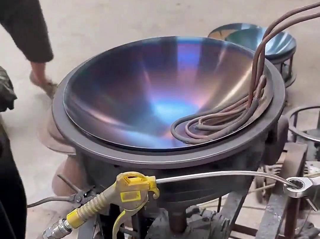 高頻感應(yīng)加熱設(shè)備在鐵鍋烤藍工藝中的應(yīng)用,是一種高效且環(huán)保的熱處理方法。烤藍是指在鐵鍋表面形成一層藍黑色的氧化膜,這層氧化膜可以提高鐵鍋的耐腐蝕性,同時賦予其獨特的美觀外觀。傳統(tǒng)的烤藍方法可能涉及化學處理或明火加熱,而高頻感應(yīng)加熱則提供了一種更為先進和控制精準的解決方案。